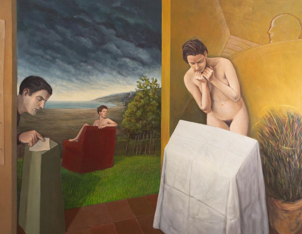 Los personajes que habitan su obra —figuras generalmente masculinas, de camisa blanca— remiten a un imaginario reconocible: el del hombre de mediados del siglo XX, con ecos del cine negro clásico. Se desplazan por espacios domésticos, sometidos a una desestabilización de su lógica espacial y funcional. “Son situaciones que no están resueltas, raras, que pueden desembocar en cualquier resultado”, explica.