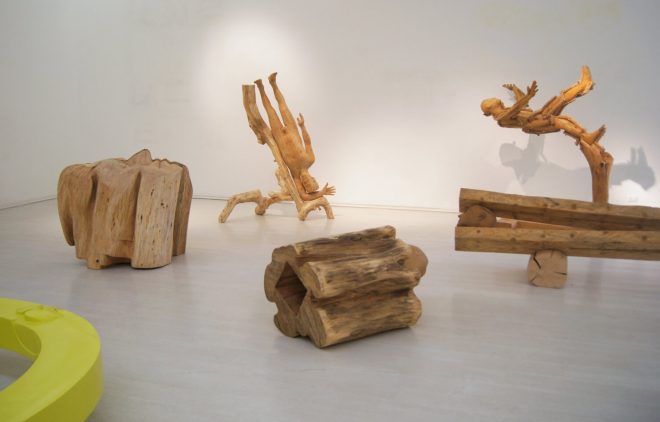 Si bien Osvaldo Peña trabajó con acero durante gran parte de su carrera, a finales de los años 90 enfrentó una crisis creativa que lo impulsó a explorar nuevas materialidades. “Gané una beca de la Fundación Andes y me fui a Chiloé, donde la madera es un elemento vital en la comunidad, presente en todo momento en su cotidianeidad. En ese entorno, me conecté con mis raíces y recuerdos de infancia. La madera se convirtió en mi elemento principal, ya que su color, textura y aromas son profundamente evocadores”, reflexiona.