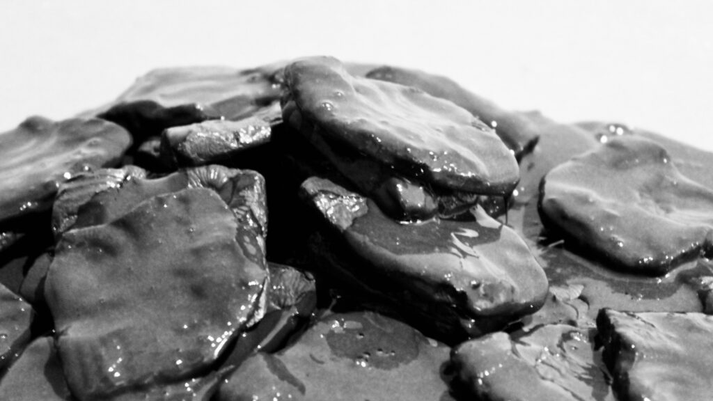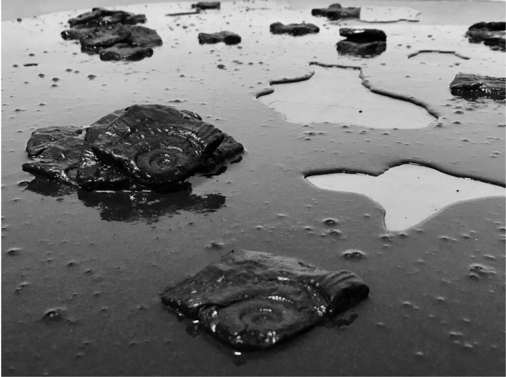 En “Petróleo” (2021), el artista aborda la contaminación ambiental y su huella en el tiempo. Esta pieza incluye un charco de “petróleo” hecho con slime negro del que emergen fósiles de ammonites. Asimismo, en “Colección” (2023), mezcla fósiles marinos impresos en 3D con madera quemada, creando un gabinete de curiosidades contemporáneo que reflexiona sobre los materiales y su permanencia en el paisaje.