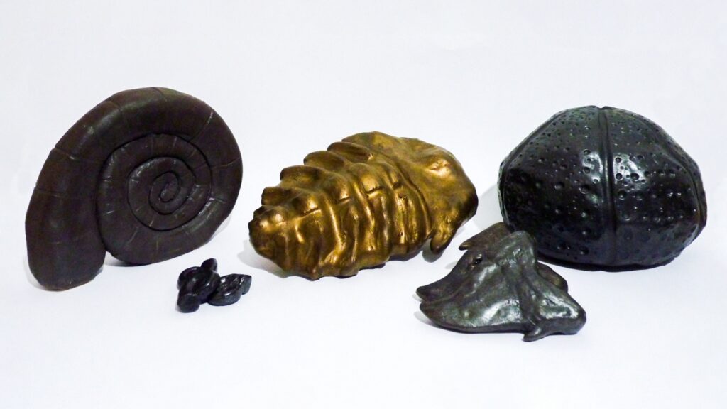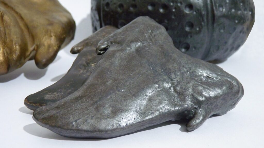 El proceso creativo de Allodi comienza con el uso de fósiles reales o modelos impresos en 3D como referencia, a partir de los cuales modela arcilla para luego incorporar óxidos metálicos que otorgan texturas más complejas a su trabajo. “Trato de realizar expediciones al menos dos o tres veces al año, buscando restos de metal o fósiles reales, como los amonites (moluscos fósiles), que luego transformo en mis obras a través de este proceso artístico”, explica.