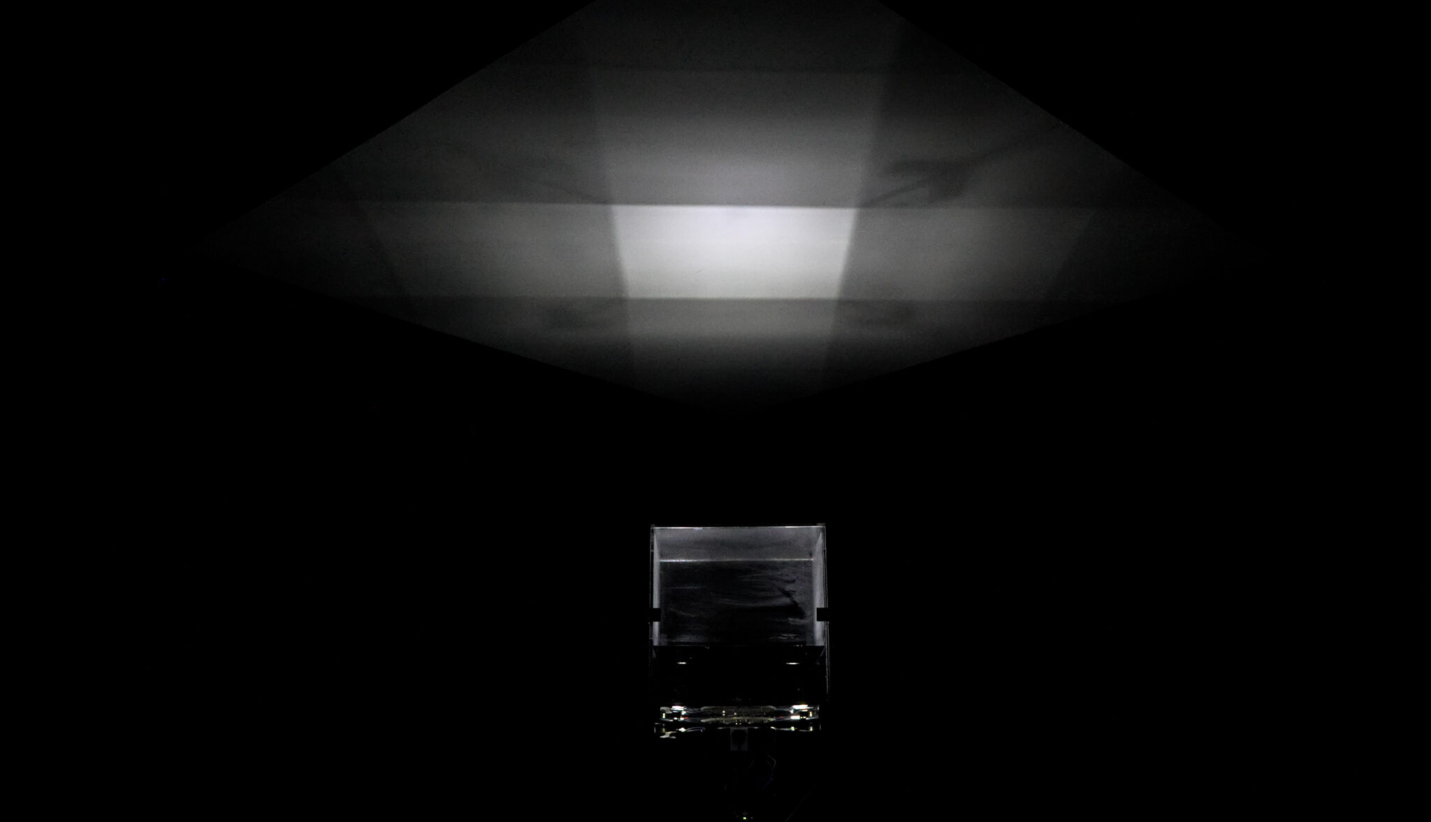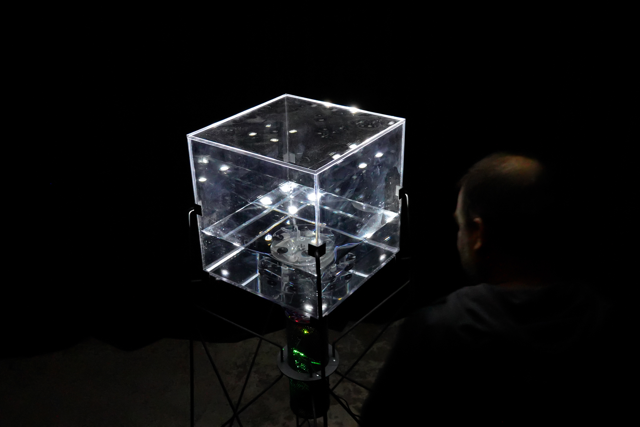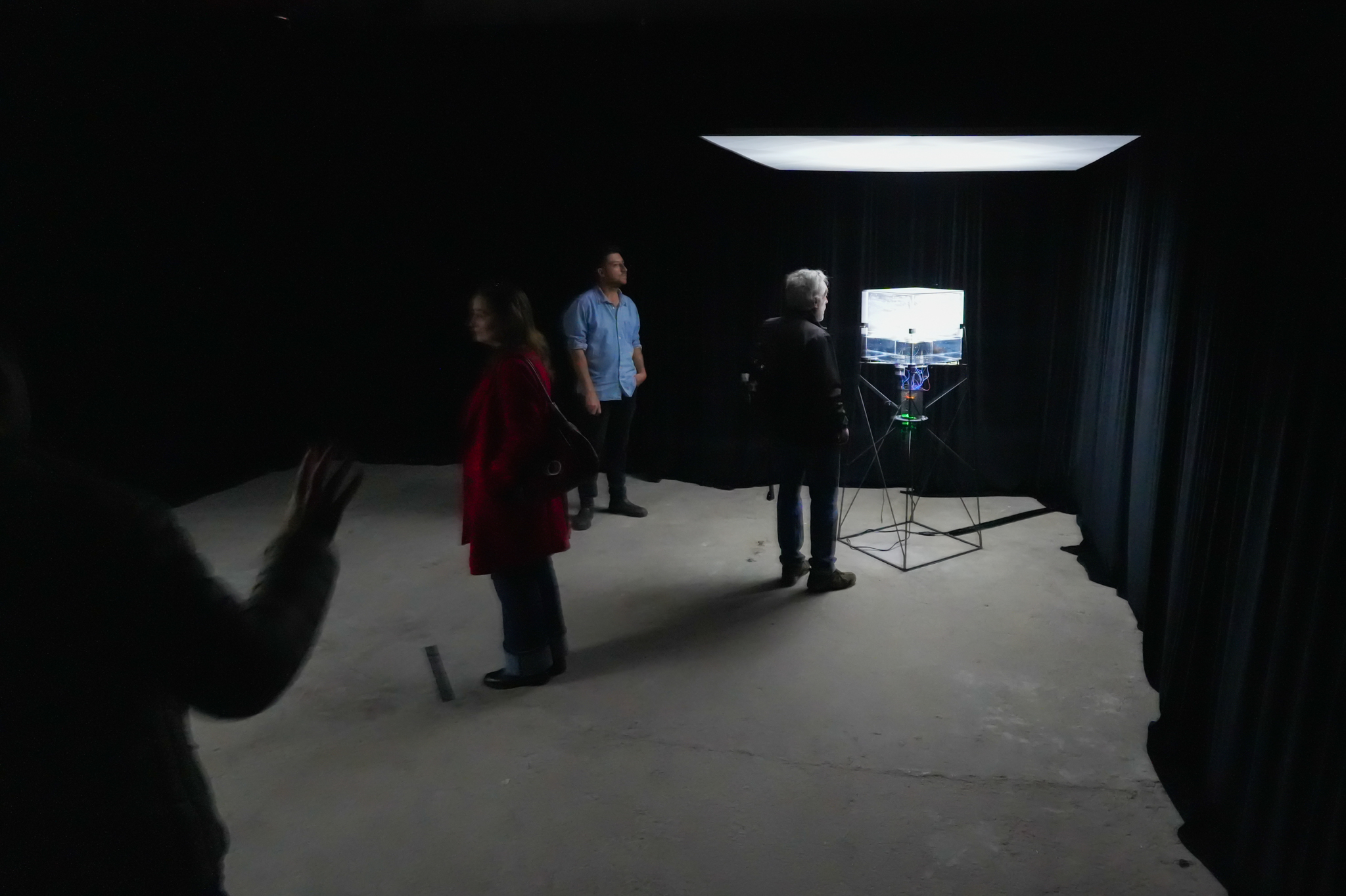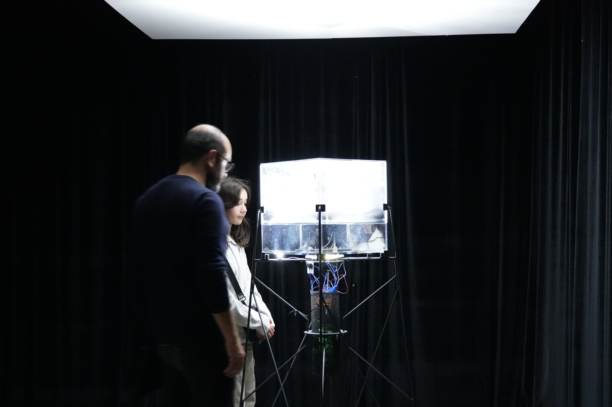La obra propone una experiencia interactiva en la que el público, al moverse entre los dos cubos, influye en las proyecciones de luz sobre un cielo simulado, recreando visualmente el vínculo que une partículas a nivel subatómico. Esta conexión cuántica simboliza cómo nuestras acciones pueden resonar en otros, sin importar la distancia. Financiada por el Fondo de Creación Artística 2022, Dos cubos entrelazados invita a los espectadores a experimentar una manifestación visual de los fenómenos intangibles de la física cuántica.