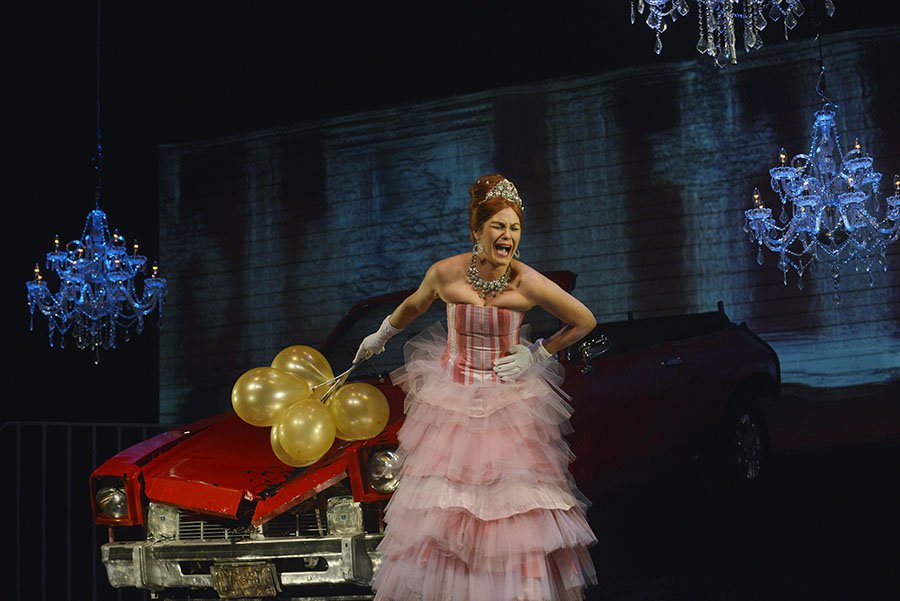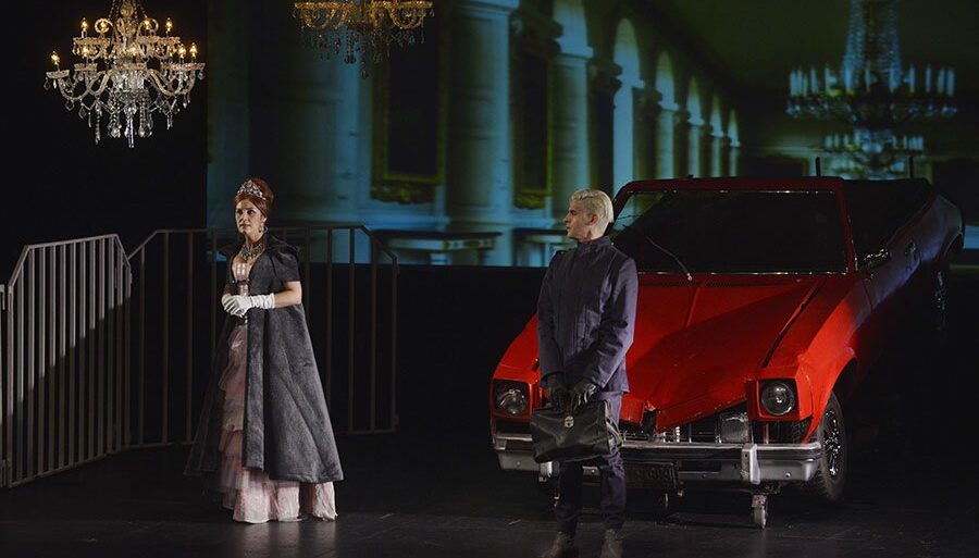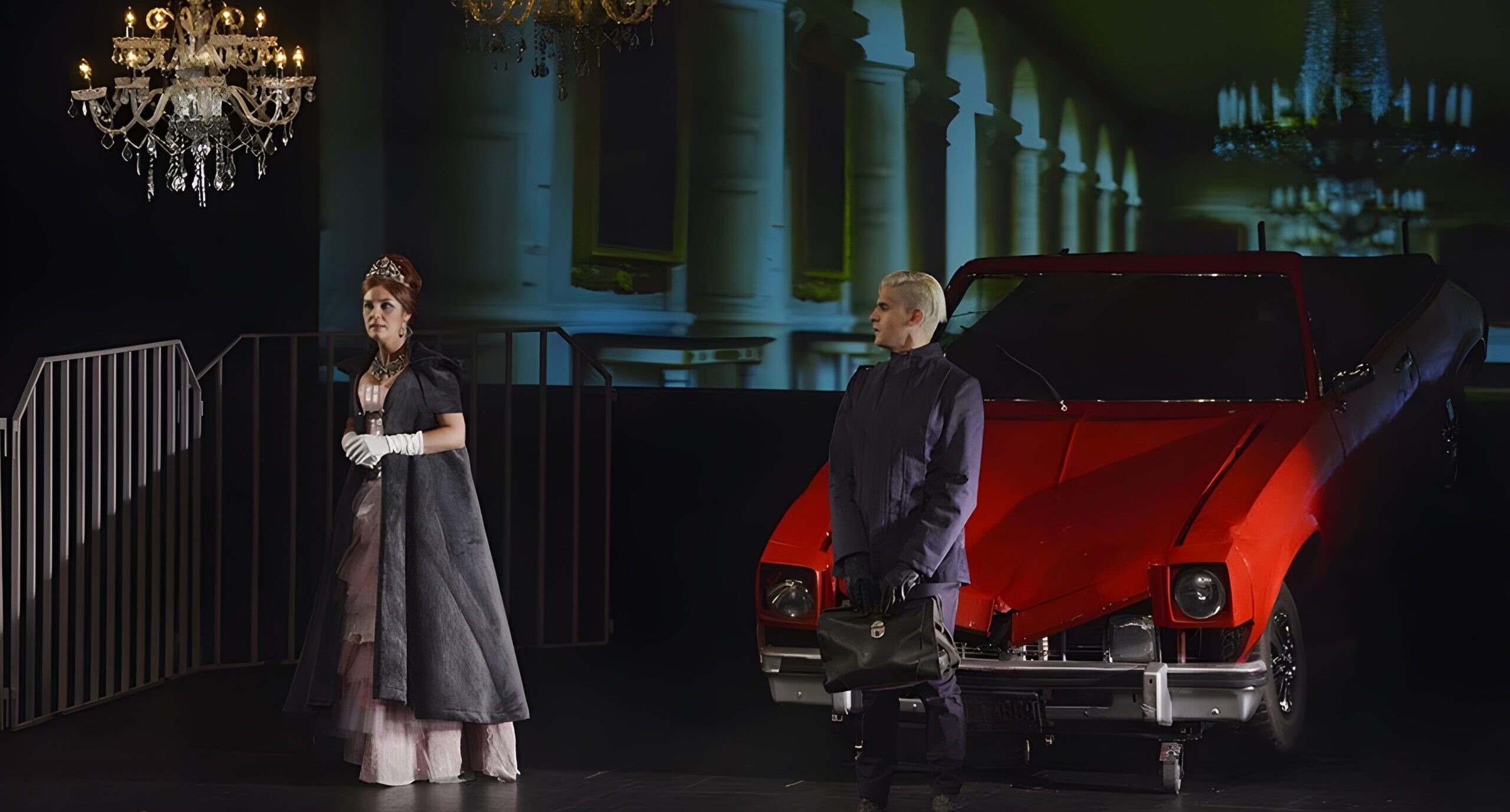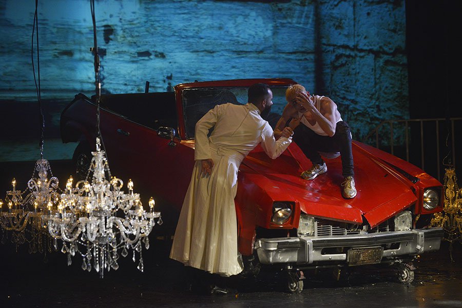 Proyecciones, música, danza moderna, aparatos electrónicos y juegos computacionales aparecen en las direcciones de Francisco Krebs. Son signos de modernidad, pero dejan en claro la ausencia de lo propiamente humano. Un auto deportivo está al centro de la escenografía, pero sus luces apenas se encienden y su capot es pisado y abollado por Hipólito y el grupo de rock, llama la atención, pero está desvencijado”.