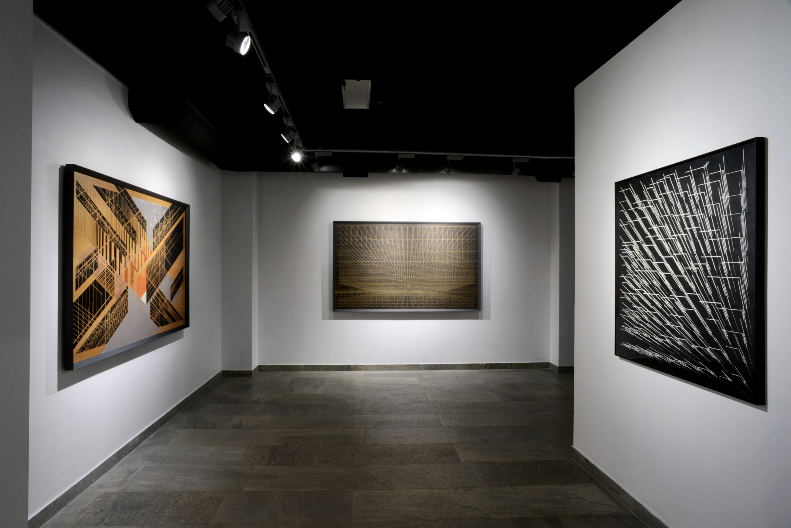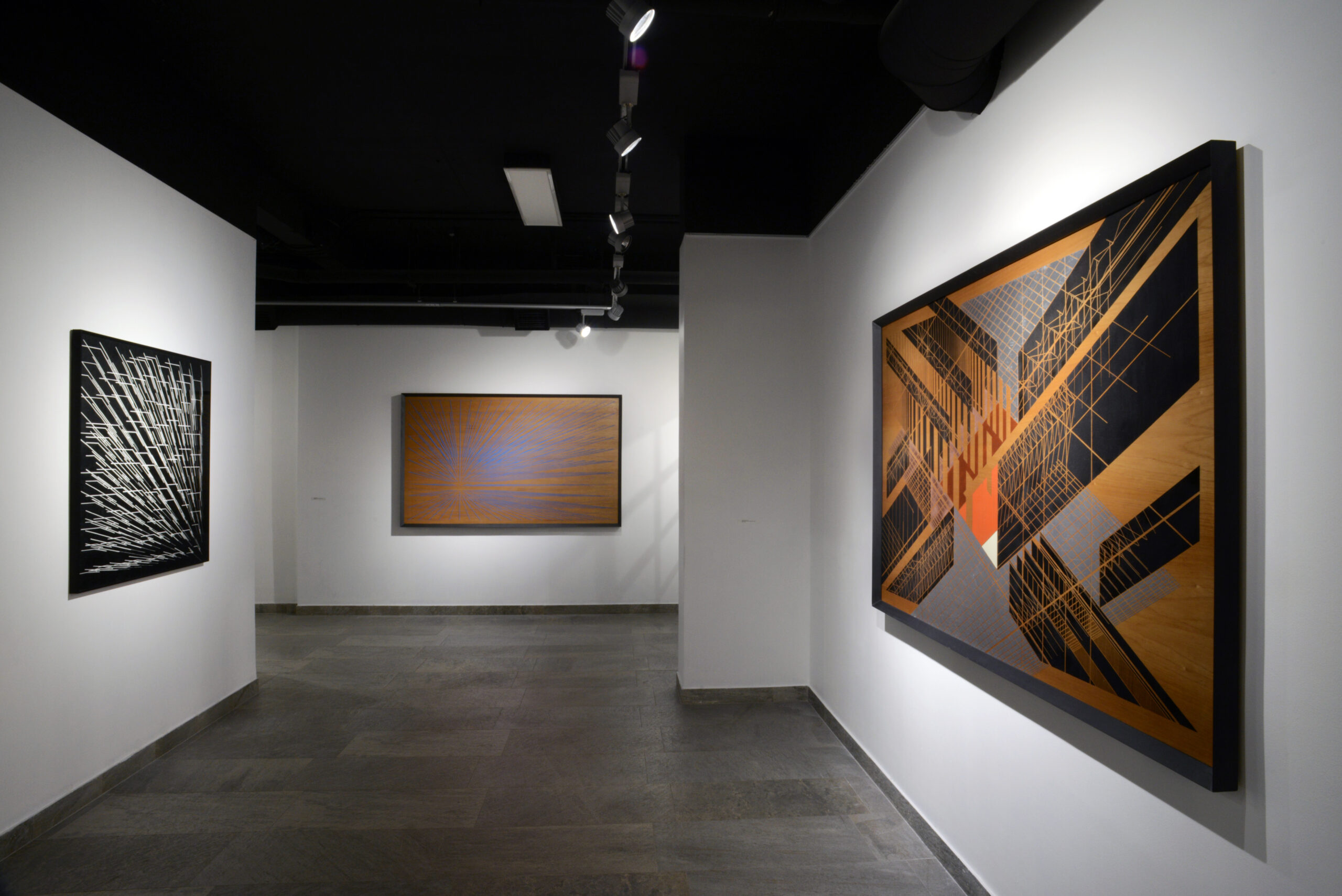 Una parte de la exposición está formada por pinturas de gran formato sobre placas de madera de cedro. La decisión de utilizar la madera como fondo origina un contraste con el color y trae el recuerdo del “árbol”, cuya estructura es aquella que se alza y desgrana hacia el cielo.